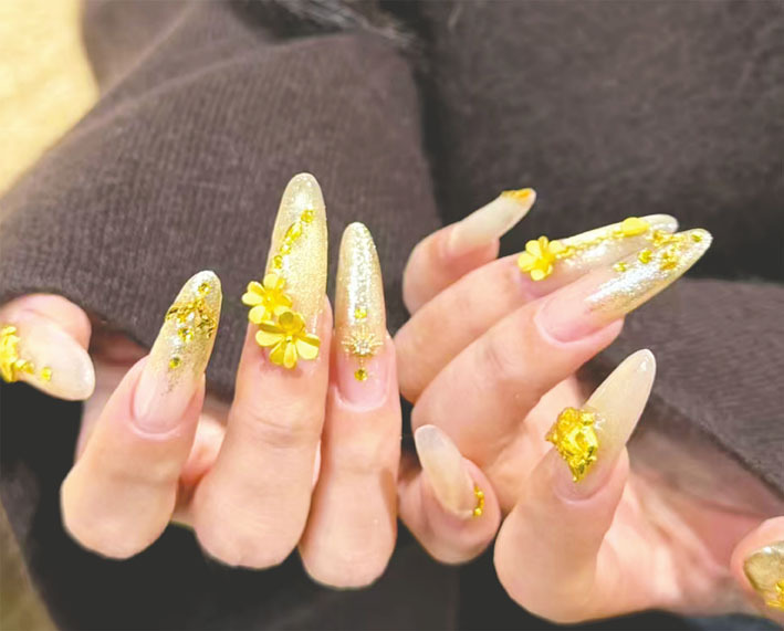 在他看来,黄金进入美甲,并不完全是涉及价格或保值的“计算题”。“万元美甲确实有博眼球的成分,但高端定制一直有需求。黄金只是被当成一种设计元素被放进来了。”